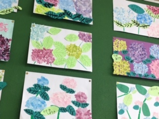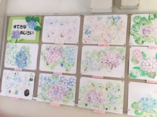 図工の時間に描いたアジサイです。1年生は、パスを塗り広げてぼかしています。2年生は、折り紙のちぎり絵風のアジサイです。どちらも趣がありますね。