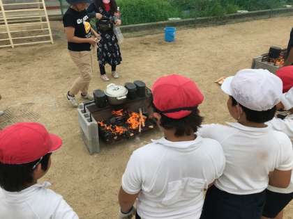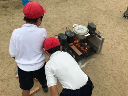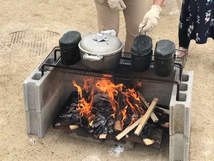 かまどで、米を炊き、カレーを作っています。仕上がりが楽しみです。