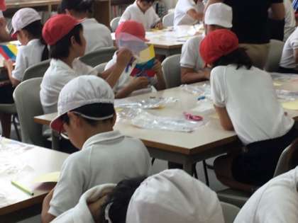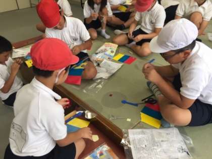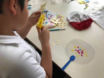 カレーができるまでの時間を活用して、図書室でステンドうちわをつくりました。カラフルなうちわが完成し、今すぐに使えそうです。