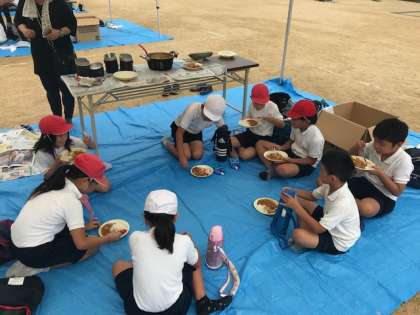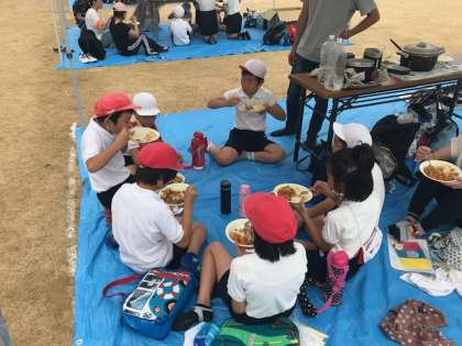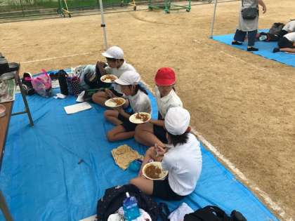 カレーが完成しました。朝から作業を重ねて、完成したカレーの味は格別でした。おかわりの行列ができています。