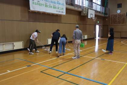 体育施設開放事業では、講堂を利用している団体が2か月に1回持ち回りで講堂のワックスがけを行うことにしています。今日は、団体の代表者が集まって、ワックスがけの講習会を行いました。