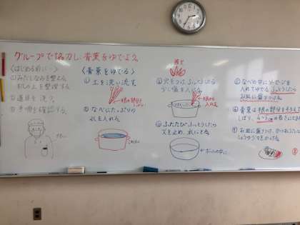 調理実習で青菜とウインナーを茹でました。それぞれで茹で時間や茹で方が違うことを学びました。