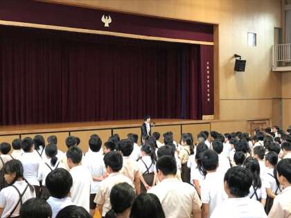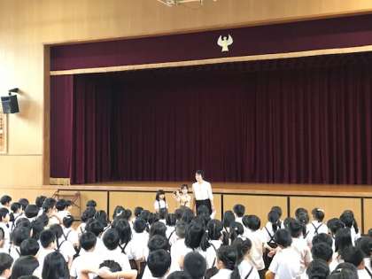 いよいよ1学期も最終日となり、終業式が行われました。1学期をもって大宮小学校を去られる先生、そして体験入学で来ていた児童からあいさつがありました。