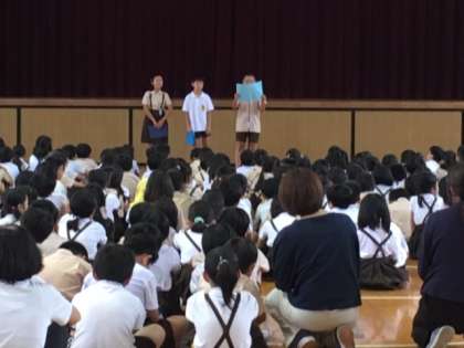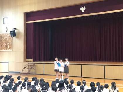 5年生3人が代表として、1学期にがんばった「学習・遠足・大宮子どもまつり」などをみんなの前で立派に発表しました。前向きに行動する姿がたくさん見られ、成長を感じました。弱い自分にならないように、これからもいろいろなことにチャレンジしていきましょう。1学期、よくがんばりました。