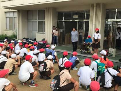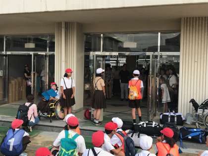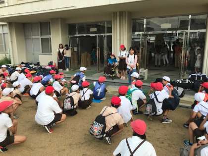 いよいよ楽しみにしていた5年生の林間学習がはじまります。出発式では、校長先生から、この2泊3日を通して、友だちのよさを見つけよう、自然のよさ(におい・音など)を肌で感じよう、自分のよさを見つけようと話がありました。児童代表のあいさつもあり、いよいよ出発です。