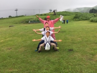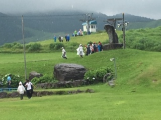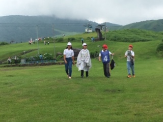 雨が小止みになり、活動班ごとにネイチャービンゴスタート!ポイントをまわってそこで指示された事を班で行なったり草花やモニュメント、クモの巣などを見つけ広い草原を回りました。