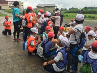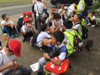 ネイチャービンゴを楽しみ、オレンジジュースを飲みました!さあ、つぎは、魚つかみです!