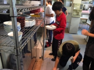 片付けもみんなが揃えたお茶碗、汁椀などを片付けるだけでなく、テーブルの下にご飯粒などが落ちていないかた確認もしています。