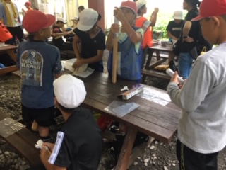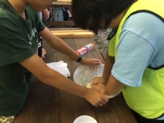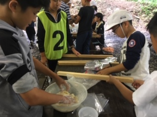 班ごとに小麦粉をこねたり、棒にアルミホイルを巻き付けたりしています。