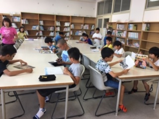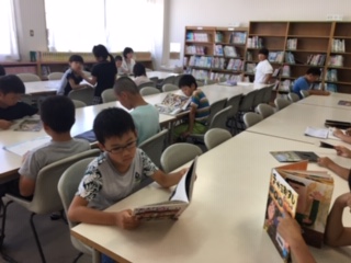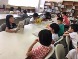 学年ごとに図書室で読書をしています。紙芝居を読んであげたり、大型絵本を一緒に読んだりと思い思いのスタイルで楽しんでいます。この夏じっくり読書に取り組んで、お気に入りの一冊ができるといいですね。