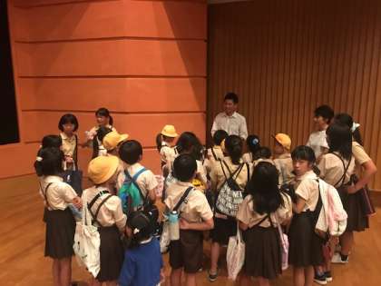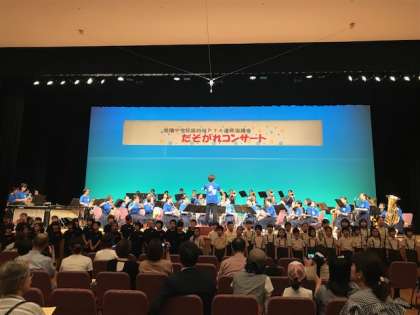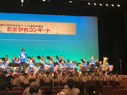 最後に旭陽中学校吹奏楽部の演奏のもと、大宮小学校、高殿小学校、高殿南小学校のみんなで、believeを歌い、旭陽中学校区がひとつとなりました。次回は、9月に敬老の集いに参加します。