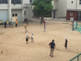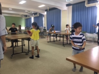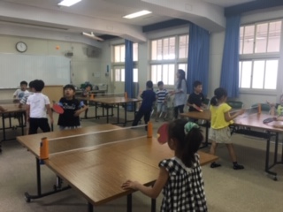 多目的室では、長机を使って卓球ゲーム、夕方少し涼しくなってからは外遊びと元気に遊んでいました。卓球では、少し経験のある子が、教えてあげたりルール説明をしたりする場面も見られました。