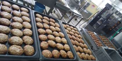 今日の献立は、焼きハンバーグ、豆乳スープ、キャベツのカレーソテー、ライ麦パン、牛乳でした。
