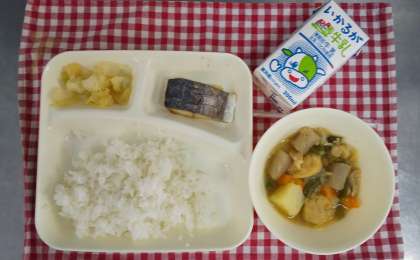 今日の献立は、さごしの塩焼き、じゃがいもと一口がんもの煮もの、キャベツのおひたし、ごはん、牛乳でした。