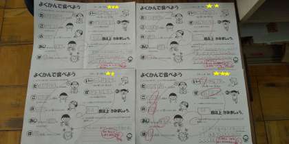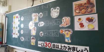 9月3日に1組、8月29日に2組で「よくかんで食べよう」の食育を行いました。