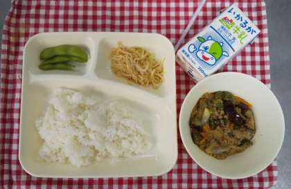 今日の献立は、マーボーなす、もやしのごま酢あえ、えだまめ、ごはん、牛乳でした。