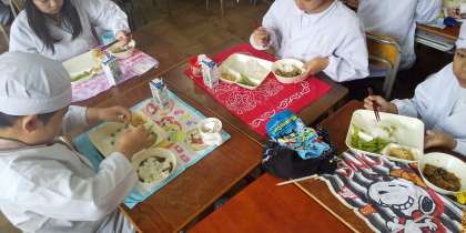 3年生の教室では、マーボーなすをご飯にのせて丼にしたり、枝豆をご飯にのせて豆ごはんにしてみたり、アレンジしている子もいましたよ。