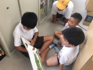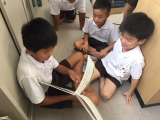 昼休みの図書館開放。図書委員会の児童が、1年生にせがまれて、絵本を読んでいます。ほほえましい風景です。
