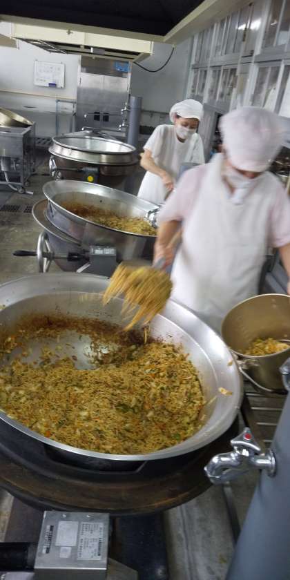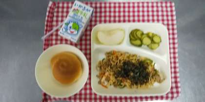 今日の献立は焼きそば、きゅうりの甘酢づけ、なし(二十世紀なし)、ミニ黒糖パン、牛乳でした。