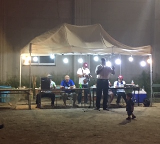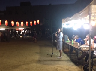 第9回、大宮地域盆踊り大会が18時から開催されました。地域活動協議会会長、旭区長の挨拶でスタート。朝から櫓を立てたり夜店の準備など、地域の皆様が惜しみなく活動を支えてくださっています。