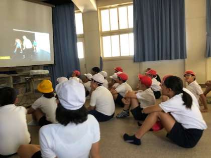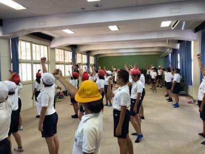 今日は暑さ指数が危険に達したため、運動会練習を涼しい多目的室で行いました。
