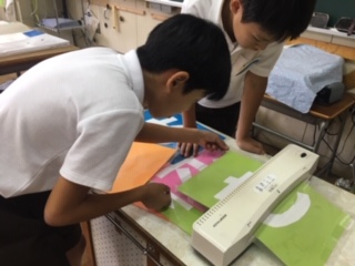 代表委員会は、4年生以上の学級から応募があった運動会スローガンを決定し、今度の児童集会で披露します。決まったスローガンをきれいに一文字ずつ作ってラミネートをかけ、当日掲示します。
