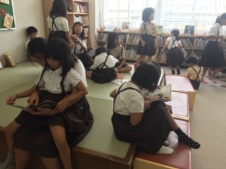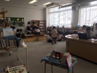 暑さ指数が昼から「危険」となり、運動場での遊びを中止しました。図書館で仲良く本を読んでいます。