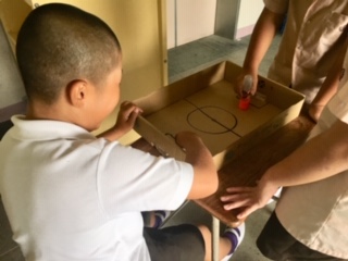 午前中は雨が降っていて、運動場に出ることができません。自分たちで遊びを考えて楽しんでいます。段ボールを使って作っていて、なかなかいいアイデアですね!