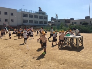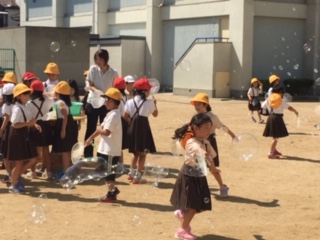 「夏を楽しもう」の単元で、シャボン玉遊びをしました。ハンガーを折り曲げたものや、うちわの骨の部分だけを使ってシャボン玉を作りました。大小たくさんのシャボン玉ができました!