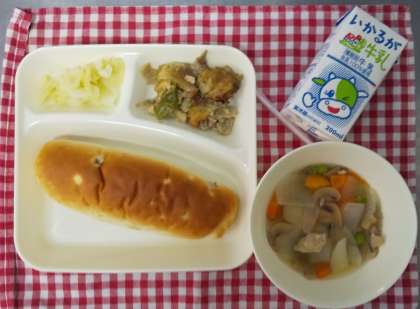 今日の献立は、豚肉のカレー風味焼き、スープ煮、サワーキャベツ、おさつパン、牛乳でした。