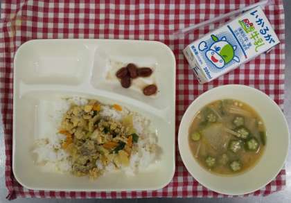 夏野菜のとうがんやオクラを使用したみそ汁は、残暑の厳しさにも負けない栄養がたっぷりです。食感もとろみがあり、子どもたちに人気でした。