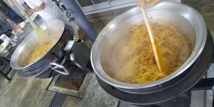 イタリアンスパゲッティは旬のピーマンも入って具だくさんで、大きな釜2つ使って調理しました。子どもたちに大人気の献立です。