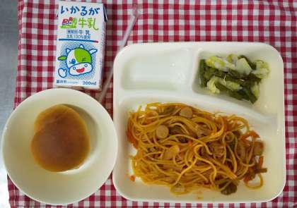 今日の献立は、イタリアンスパゲッティ、グリーンアスパラガスとキャベツのサラダ、ミニ黒糖パン、牛乳でした。