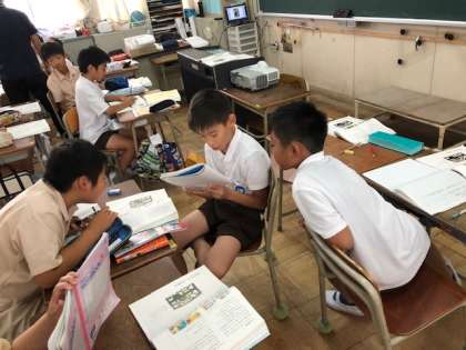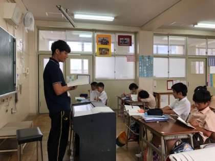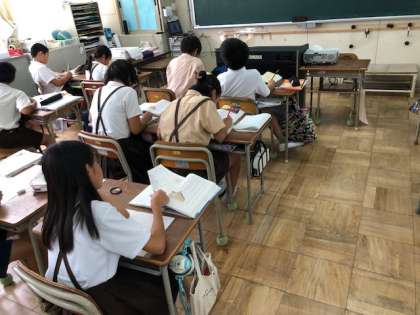 教育実習のN先生が音読するのを聞きながら、子どもたちは本文の気になったところに線や印を書き込んでいきます。