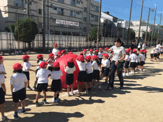 運動会で全校生が参加する大玉運びの練習を行いました。1年〜2年は大玉を転がし、3年〜6年は大玉を持ち上げて送っていきます。