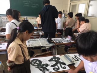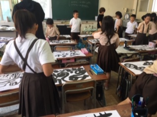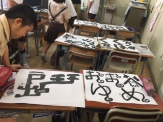 自分の名前を書体を変えたり、色々な模様をつけたりする「ネームアート」作りの途中です。友達の作品の良いところを見つける「お散歩交流」をしました。