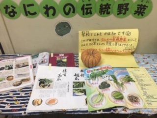 食育ルーム前に展示しています。本校でも、こつまなんきんを作りました。他にもおおさかしろななどを栽培した年もあります。給食にも大阪の伝統野菜を使った献立があります。