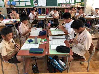 5年生の音楽では、鑑賞「威風堂々」の学習に続き、イの部分の旋律をリコーダーで練習しました。