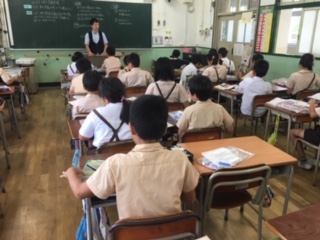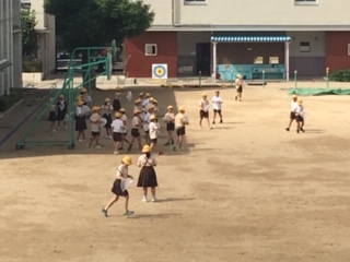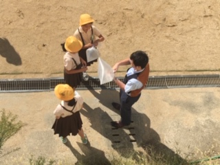 「とじ込めた空気を押したらどうなるか」予想を立て、実際にビニル袋に空気を入れて運動場で確かめました。