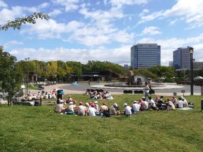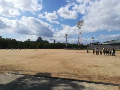 次に、大阪城公園で昼食を食べた後、観光に来ていた外国の人たちに、英語でインタビューをしました。「どこから来られましたか」「好きな日本食は」などの質問に、外国の方たちは親切に答えてもらい、子どもたちは「優しかった」「考え方が変わった」などの」感想をつぶやいていました。