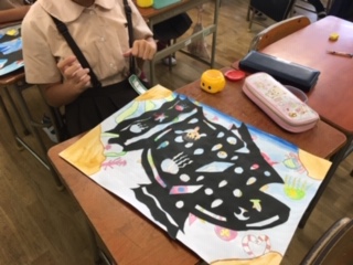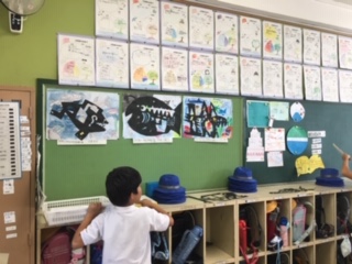 海の中の様子を絵の具で描いた後、切り絵の手法を使って大きな魚を貼り付けました。大きな魚の出現で、勢いのある絵に仕上がりました!