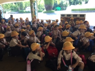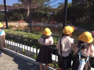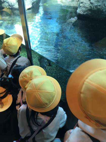 天王寺動物園に行きました。最初に荷物を置いてお弁当を食べる場所を確保。水筒とハンカチ、ティッシュを持って出発です!ワニがちょうど顔を出しました!