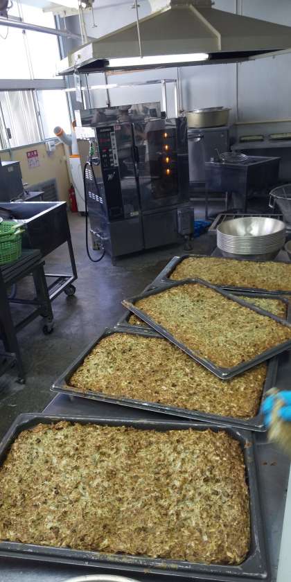 今日の献立は、年に1回のお好み焼きと豚汁、きゅうりの甘酢あえ、ごはん、牛乳でした。