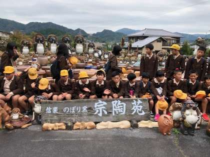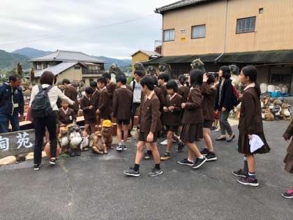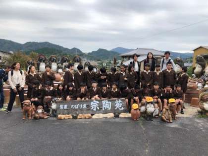 トイレを済ませてタヌキの置き物とともにクラス写真です。