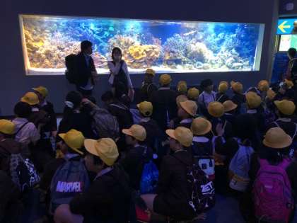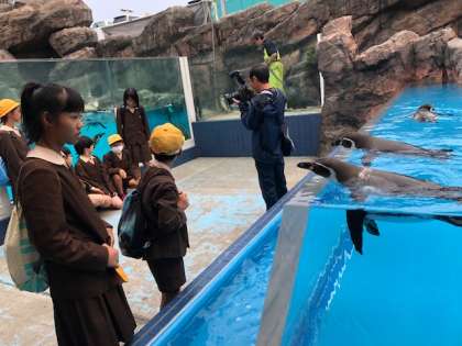 ペンギンがすいすい泳ぐ前でグループ写真です。