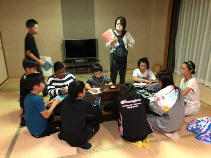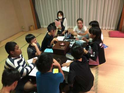 活動班の班長会議です。「明日は協力できるようにがんばる」「今日の反省を生かしてがんばります」…いろいろな反省が出てきました。