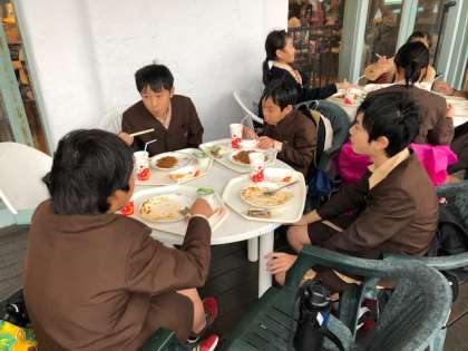写真のあとは、クーポンを使って、グループ単位で昼食を取っています。