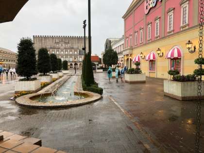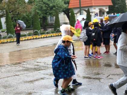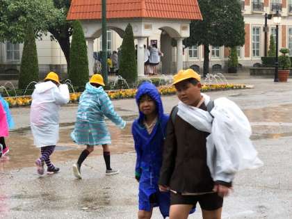 本降りの雨、多くの子どもたちは昼食を済ませ、おみやげを選んでいます。