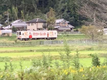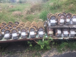 草津パーキングエリアで1回目の休憩ご、宗陶苑へ。朝ドラの看板が大きく出ていました!たくさんの狸が出迎えてくれました!?
