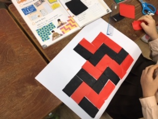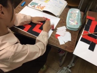 折り紙を四角形や三角形に切って、教科書と同じ模様を作っています。なかなか色と向きが合わず難しいところもあります。
